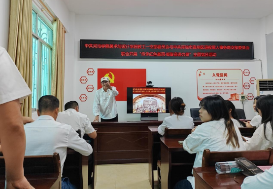 美设公司教工第一党支部书记韦景耀首先讲话,他指出:今年正值中国人民抗日战争胜利80周年、中国共产党第七次全国代表大会召开80周年,我们要以此为契机,开展形式多样的党史学习教育。强调新时代的共产党员更需传承红色基因,将抗战精神转化为实际行动,立足本职工作,为地区发展贡献力量。